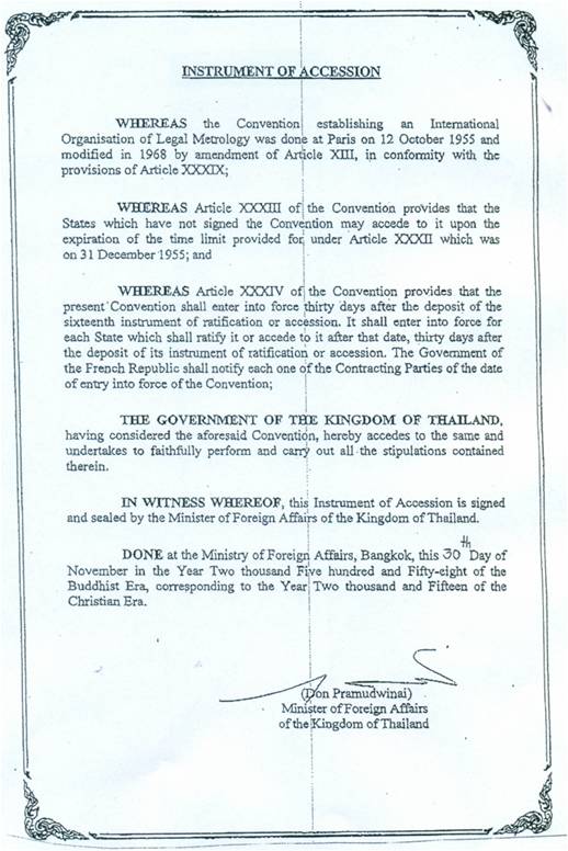 รูปที่ 5 Instrument of Accession ลงวันที่ 30 พฤศจิกายน พ.ศ. 2558; OIML