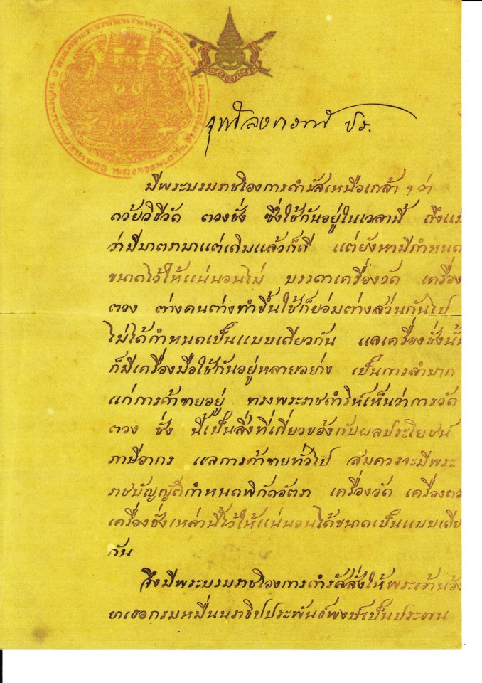 “พระบาทสมเด็จพระรามาธิบดีศรีสินทรมหาวชิราวุธ พระมงกุฎเกล้าเจ้าอยู่หัว ทรงพระราชดำริห์ว่า พระราชอาณาจักรสยามในเวลานี้ยังไม่มีวิธีชั่งตวงวัดเป็นสมานรูป ซึ่งกำหนดเป็นแบบมาตราและบัญญัติเป็นกฎหมาย สมควรจะมีวิธีเช่นที่กล่าวนี้ขึ้น