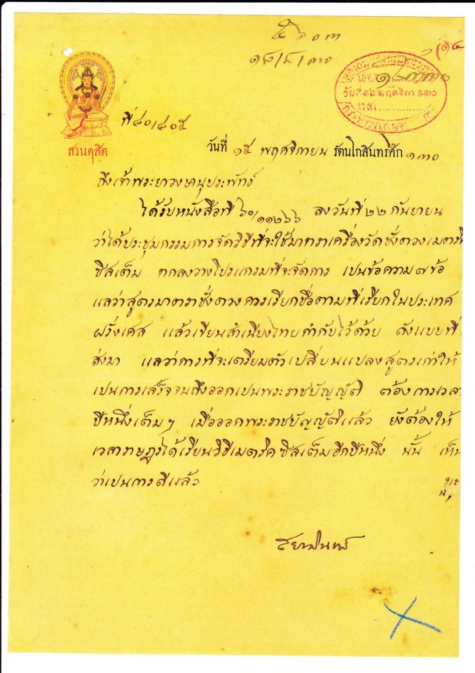 อนึ่ง วิธีชั่งตวงวัดของประเทศสยามนั้น ควรอนุโลมตามวิธีแห่งนานาประเทศสุดแต่จะสมกับความประสงค์ภายในพระราชอาณาจักร และวิธีเมตริกนั้นปรากฏว่าได้ใช้กันไพศาลแล้ว