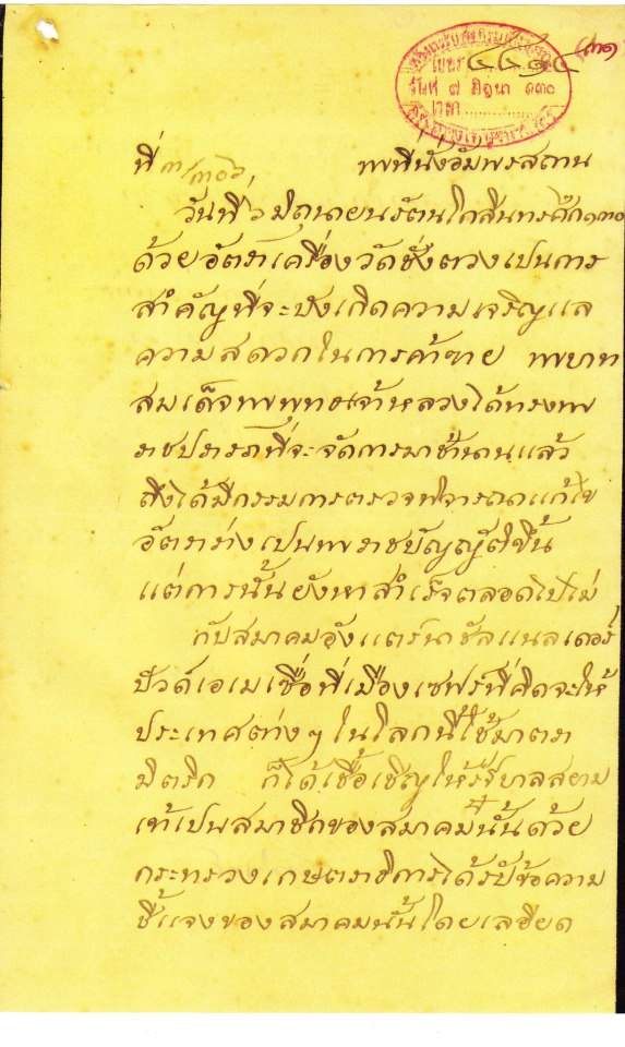 เมื่อรัฐบาลสยามเข้าเป็นสมาชิกสำนักงานมาตราชั่งตวงวัดระหว่างประเทศ (BIPM) ต้องเสียเงินค่าเข้าเป็นสมาชิกเมื่อปี พ.ศ. 2455 และได้จำลอง “แบบประถมตัวมาตรา (Prototype)” จาก BIPM รวมทั้งถ่ายทอดความเที่ยงจากแบบประถมตัวมาตราลงมายังชั้นความเที่ยงต่ำกว่าซึ่งเรียกว่า “แบบมาตรา (Standard)” เพื่อใช้สำหรับการสอบเทียบเครื่องชั่งตวงวัดที่ใช้ในประเทศสยามในขณะนั้น ซึ่งในเวลานั้นทั้งแบบประถมตัวมาตรา (Prototype) และแบบมาตรา (Standard)” เก็บรักษาไว้ในกระทรวงเศษฐการ