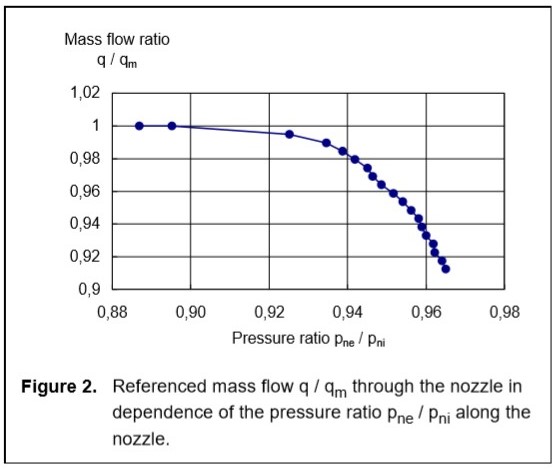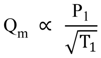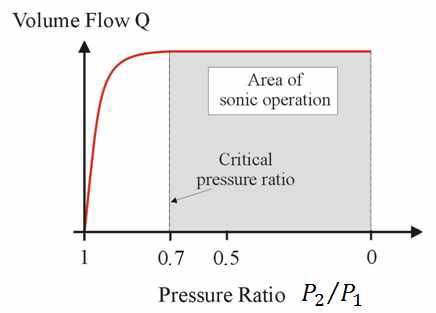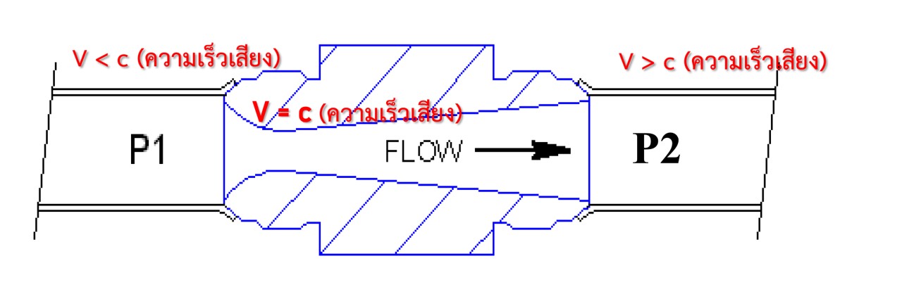 รูปที่ 20 อัตราส่วนความดันระหว่างความดันทางเข้า (P1) ต่อความดันทางออก (P2) ตัว Sonic Nozzle มีค่า P1/P2≥ 1.2 หรือ P2/P1≤ 0.833 (แต่ในบางผู้ผลิตอาจไม่ได้ค่านี้) เพื่อสามารถใช้ประโยชน์จากหลักการทำงานของ Sonic Nozzle บริเวณที่อัตราการไหลมวลคงที่