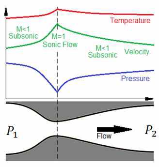 ในขณะที่เกิดสถานะ "choked" หรือ "sonic" state ของ Sonic Nozzle นั้นพบว่าสถานะอุณหภูมิ ความเร็ว และความดันของก๊าซที่ไหลผ่าน Sonic Nozzle ดังรูปที่ 22 ถึง รูปที่ 25 เมื่อดูรูปที่เกี่ยวข้องทั้งหมดสำหรับในกรณีของเราที่ใช้ Sonic Nozzle เป็นแบบมาตราจะเกิดขึ้นในกรณีเดียวคือ ก่อนทางเข้า Sonic Nozzle ความเร็วของก๊าซเป็น Subsonic (M<1) เมื่อไหลผ่านคอคอดแล้วความเร็วของก๊าซเป็น Sonic (M = 1) จากนั้นเมื่อก๊าซไหลผ่านคอคอดไปความเร็วของก๊าซเป็น Subsonic (M<1) เพราะถ้าความเร็วก๊าซด้านทางออกของเรามีความเร็วมากกว่าความเร็วเสียง หรือ Supersonic (M > 1) เราคงหูหนวกจนหูดับแน่ ๆ ครับ เพราะจะเกิด Sonic Boom แต่คิดว่าชาตินี้เราก็ไม่เจอความเร็วของก๊าซสูงกว่าความเร็วเสียงเหมือนตัวเครื่องบินขับไล่ที่มีความเร็วเหนือเสียง March 5 (เร็วแต่ตัวเครื่องบินน่ะ แต่อากาศมันจะเร็วกว่าความเร็วเสียงหรือเปล่าอันนี้ยัง งง... เพราะอากาศไม่ได้ติดจมูกไปกับจมูกเครื่องบินนี้ตอนที่ทำความเร็ว March 5) หรืออาจไม่ได้ยิน หรือเราก็อาจได้ยินเสียงดังบางในระดับที่รำคาญ เสมือนได้ยินเมียบ่น..... บ่ ย่าน...... ชั่งตวงวัดทนได้.......