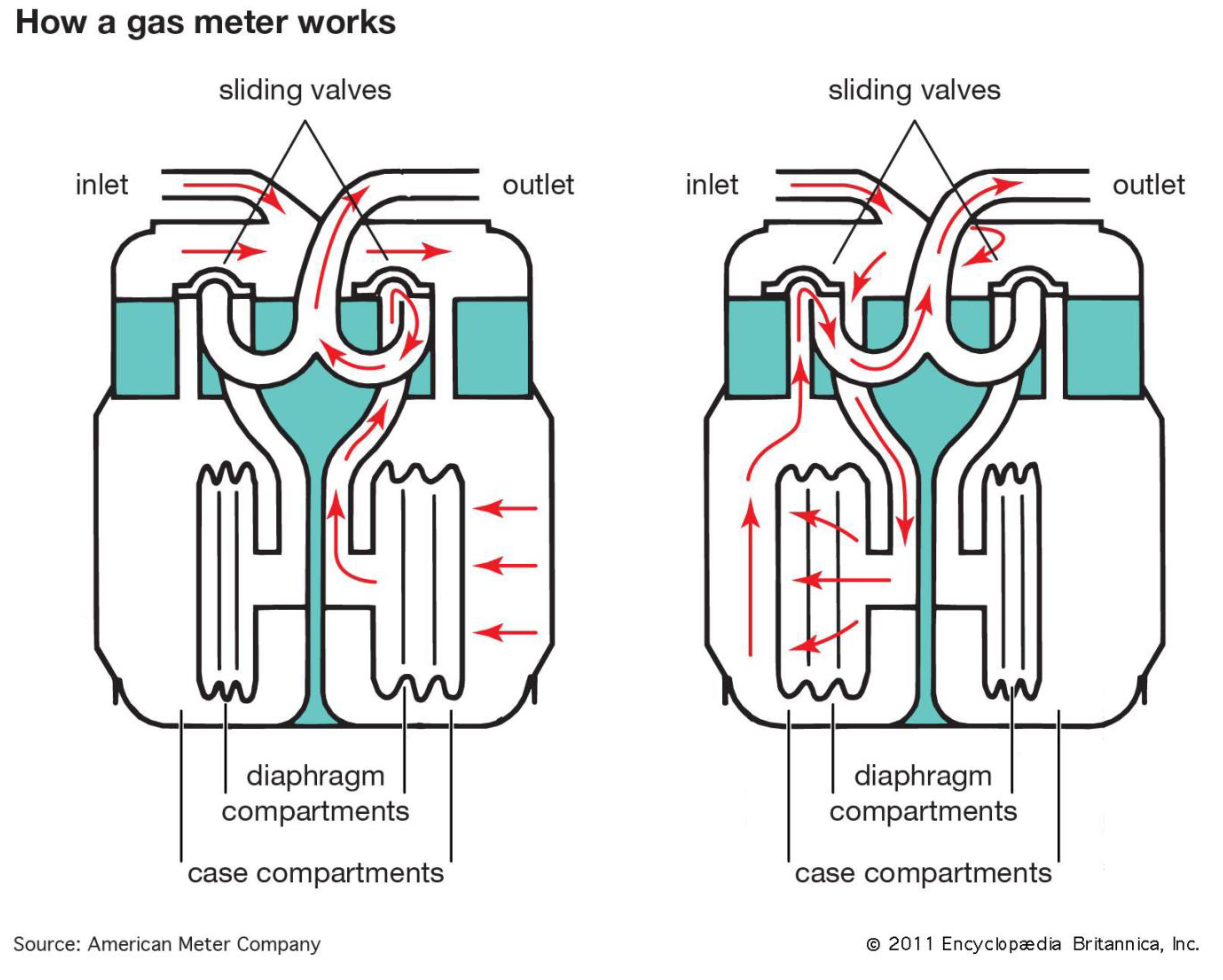 สำหรับการทำงานของมาตรวัดปริมาตรก๊าซแบบไดอะแฟรมนั้น จะมีตัวไดอะแฟรมซึ่งทำจากวัสดุที่มีความยืดหยุ่น สามารถทนแรงดันที่ไม่สูงมากนักอีกทั้งต้องไม่ทำปฏิกิริยากับตัวก๊าซ LPG เช่นทำจากผ้าโพลีเอสเตอร์เคลือบด้วยยางสังเคราะห์ไนไตรด์ โดยทั่วไปจะมีตัวไดอะแฟรมจำนวน 2 ตัวทำหน้าที่เป็นส่วนวัดปริมาตรก๊าซสลับกันไปมาโดยทำงานร่วมกันและสอดคล้องกันกับการสลับปิด-เปิดของวาล์วทางเข้าไดอะแฟรมทั้ง 2 ตัวโดยใช้ความดันของตัวก๊าซเองซึ่งมีความดันไม่สูงในการขับเคลื่อนให้ส่วนวัดปริมาตรก๊าซที่เป็นตัวไดอะแฟรมซึ่งคล้ายกับกล่องหีบเพลงเคลื่อนที่ฟองตัวยุบตัวสลับกัน โดยมีค่าปริมาตรก๊าซรวมคงที่ต่อรอบการพองตัวและยุบตัวไดอะแฟรมทั้ง 2 ตัว เช่น 1.2 dm3/rev เป็นต้น ก็ค่อยๆดูค่อยๆอ่านดังในรูปที่ 7