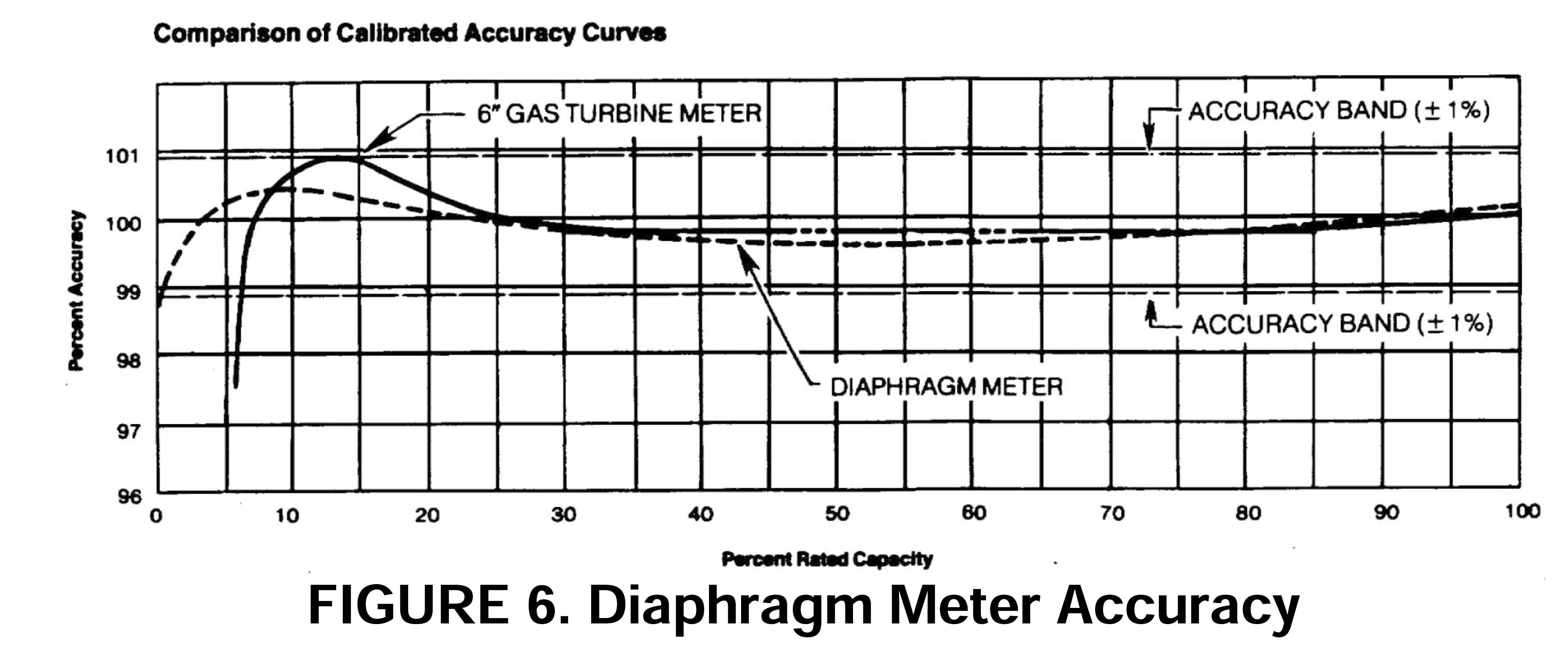 รูปที่ 8 กราฟสมรรถนะโดยทั่วไป (Diaphragm Meter Accuracy) ของมาตรวัดปริมาตรก๊าซแบบไดอะแฟรม